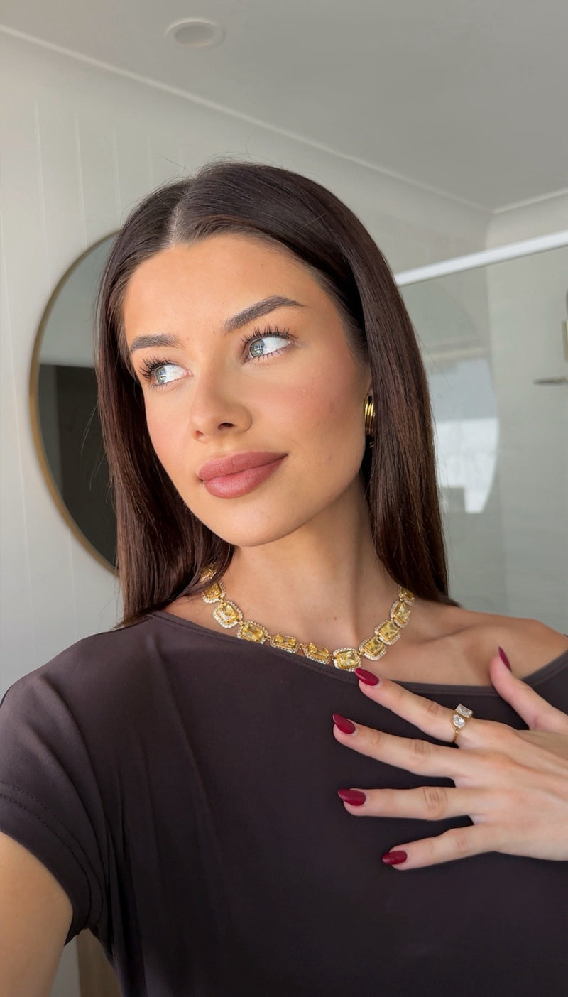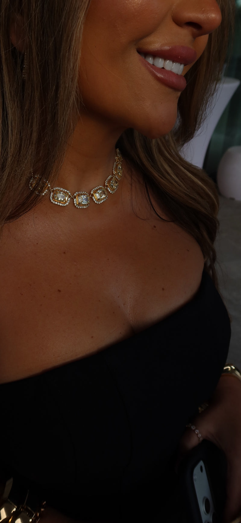 The Belle Choker is pure golden radiance. Set with shimmering champagne-hued stones, each framed in sparkling cubic zirconia and finished in 18k gold plating, She shines with effortless elegance.